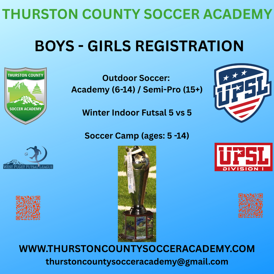 ContentFORMING TEAMS NOW !!!BOYS - GIRLS WINTER, INDOOR 5 vs 5 futsal LEAGUEspring, outdoor soccer league CLICK HERE!!! Register: TCSAY MLS-GO SOCCER LEAGUE - THURSTON COUNTY SOCCER ACADEMY________________________________________________________________WWW.THURSTONCOUNTYSOCCERACADEMY.COM* MEN'S*WOMEN'S SEMI-PRO TEAMS ________________________________________________________________________________________________________________________________________________________________________________________________________________________________________